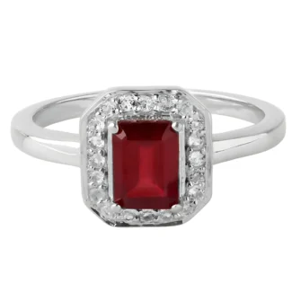 Sterling Silver Ring with Rectangular Red Gemstone and Double Halo