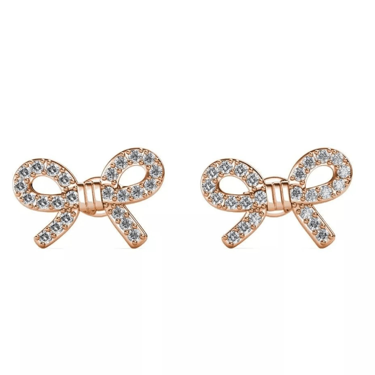 These charming studs add a touch of feminine elegance. Shaped like a perfectly tied bow, the entire surface is covered with sparkling pave cubic zirconia stones set in a beautiful rose gold-tone finish.