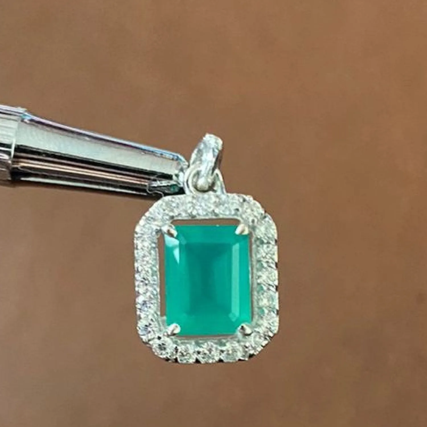 A sophisticated pendant showcasing a rectangular, emerald-cut Green Onyx stone. The rich green gem is highlighted by a glittering surrounding halo of small cubic zirconia (CZ) stones, giving the piece an elegant and refined sparkle.
