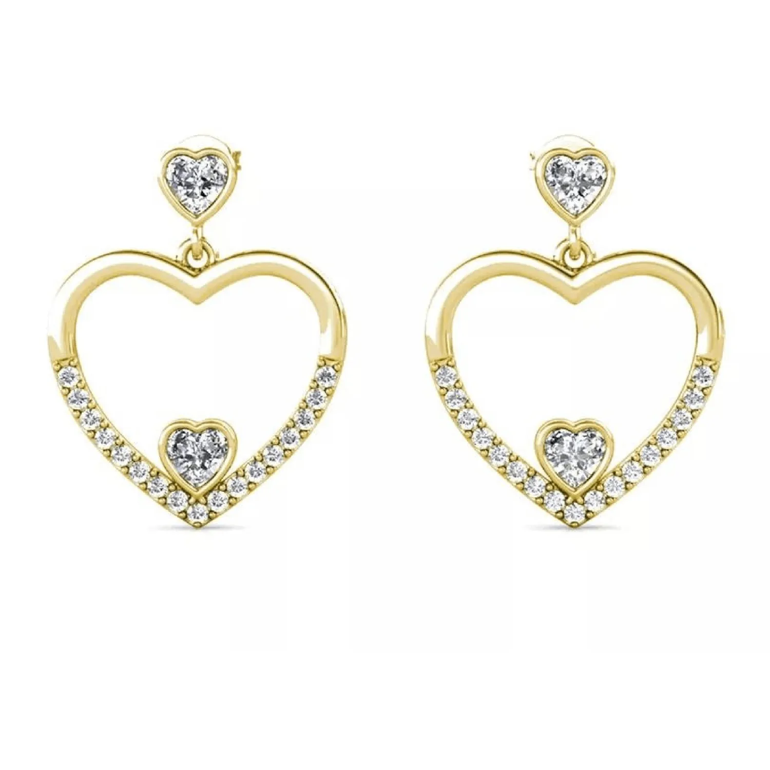Express your love with these stunning gold-tone drop earrings. The design connects a heart-shaped CZ stud to a larger open heart frame. The bottom curve of the main heart is lined with brilliant pave cubic zirconia, with an additional heart-shaped CZ suspended in the center.