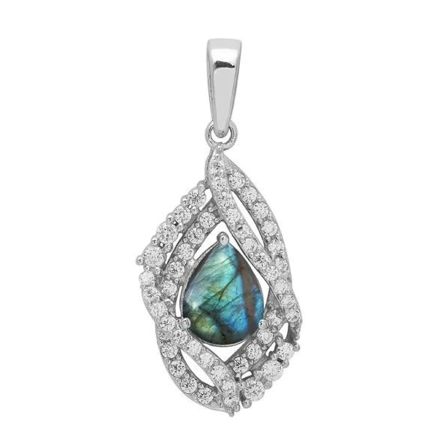 An eye-catching pendant featuring a luminous pear-shaped labradorite stone, showcasing its characteristic blue and green flashes (labradorescence). The stone is surrounded by an elegant, flowing swirl design accented with sparkling cubic zirconia (CZ) gems.