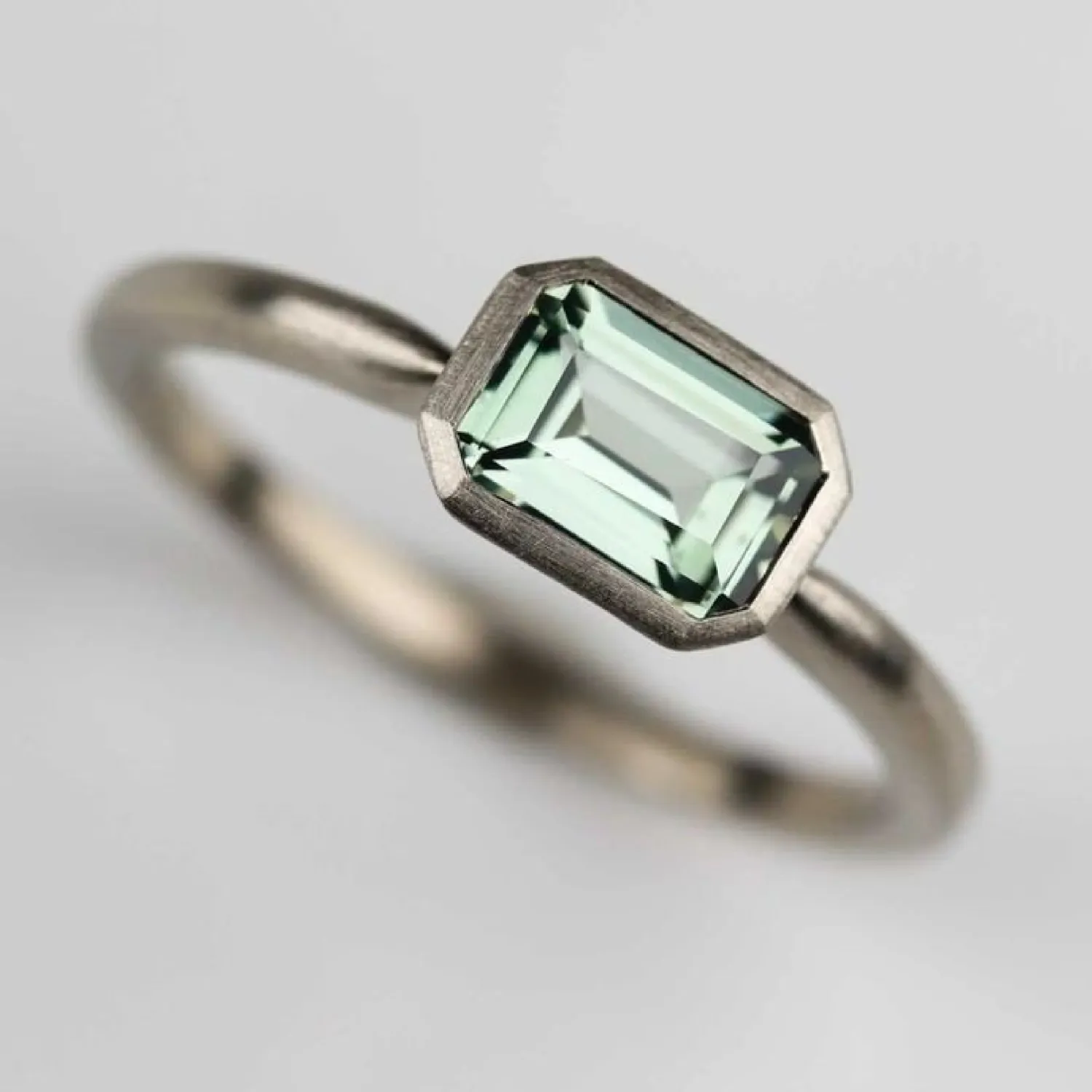 A striking ring with a contemporary matte silver (or white gold) finish. It features a rectangular (emerald-cut) light mint green tourmaline gemstone, completely enclosed in a bold, geometric bezel setting.