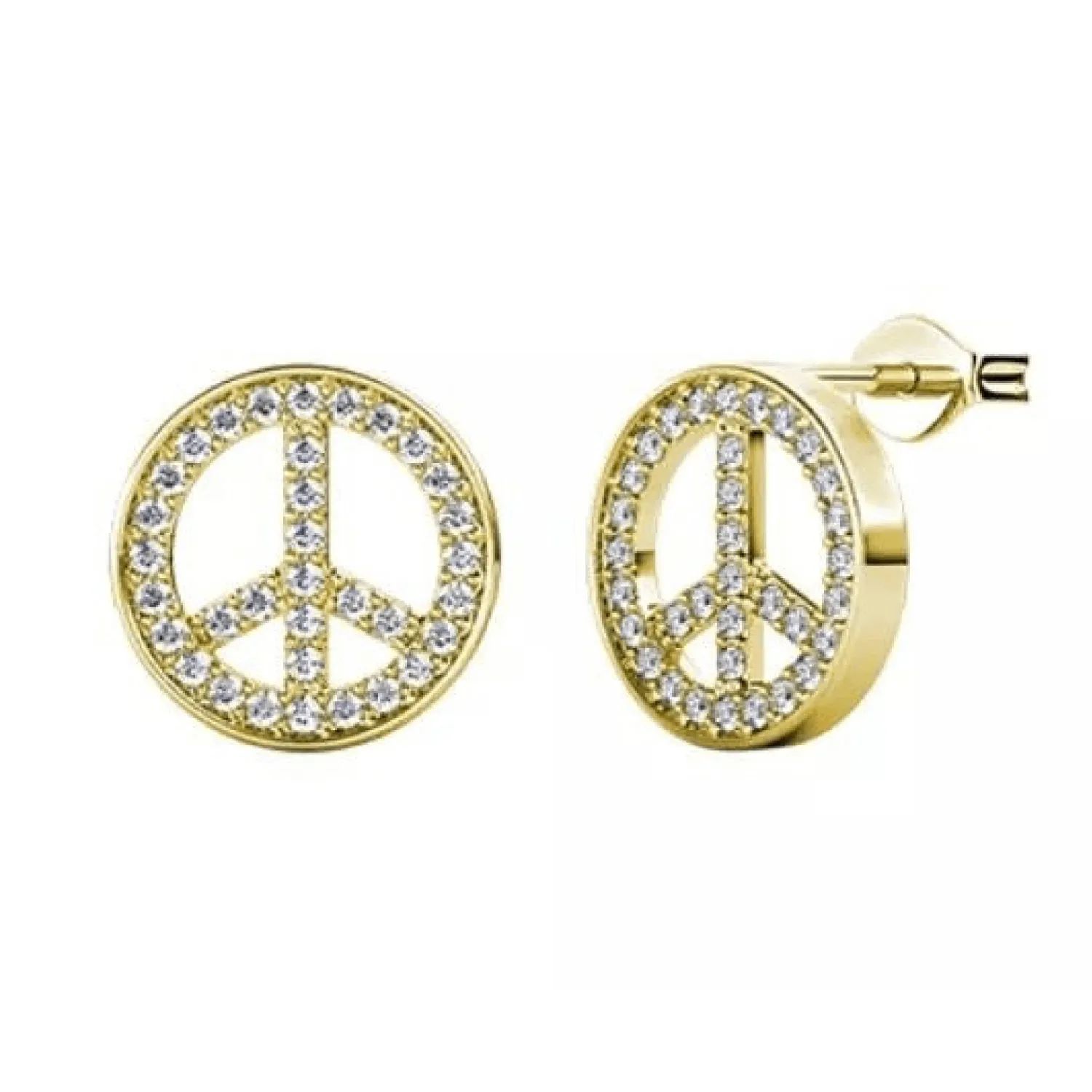 A shimmering rendition of the classic peace symbol. These studs are fully adorned with pave cubic zirconia stones within a circular frame, all finished in a beautiful gold tone. Perfect for a touch of retro charm.