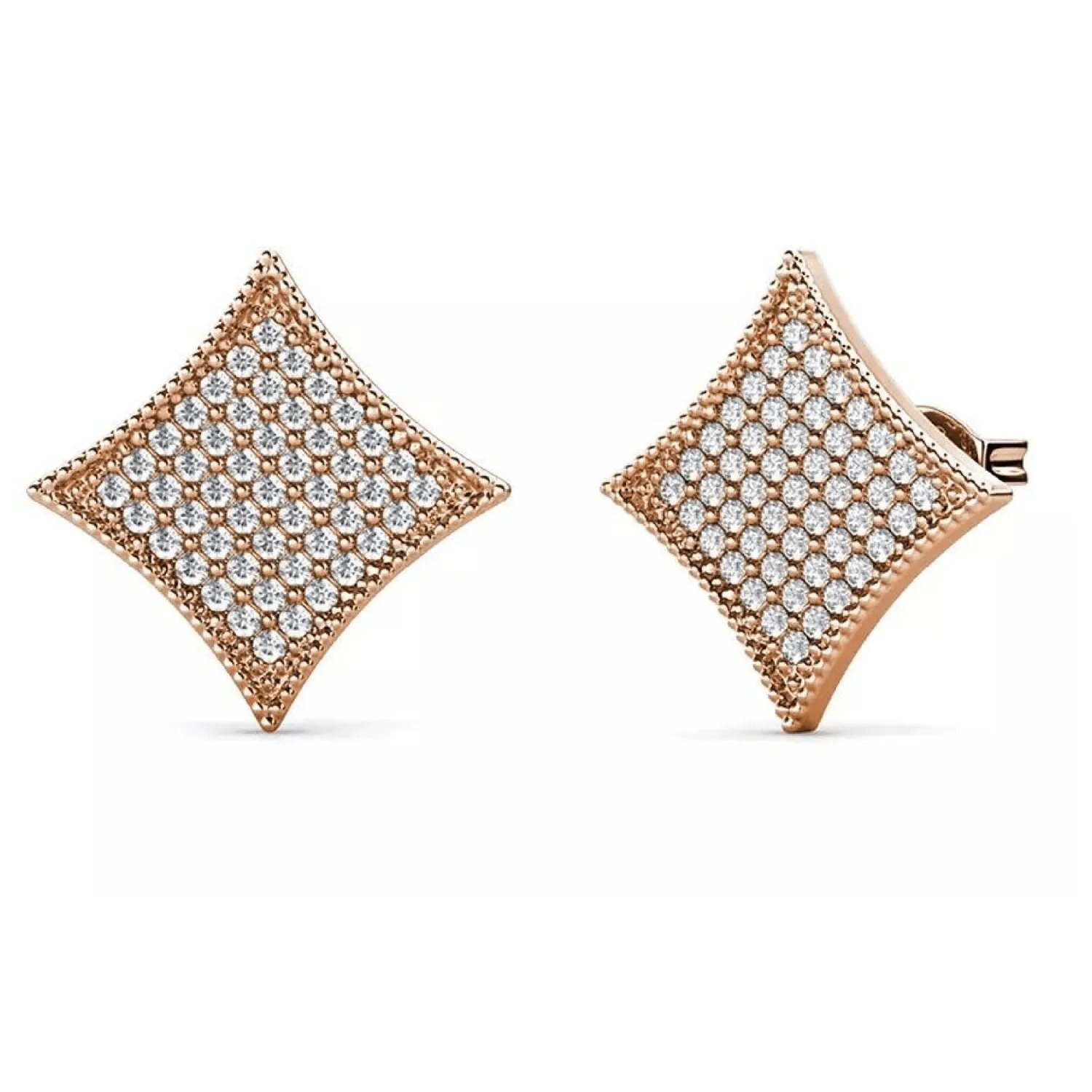 These modern, pointed kite-shaped studs feature a high level of sparkle. The entire surface is covered in pave cubic zirconia stones, all set in a luxurious and soft rose gold-tone finish.