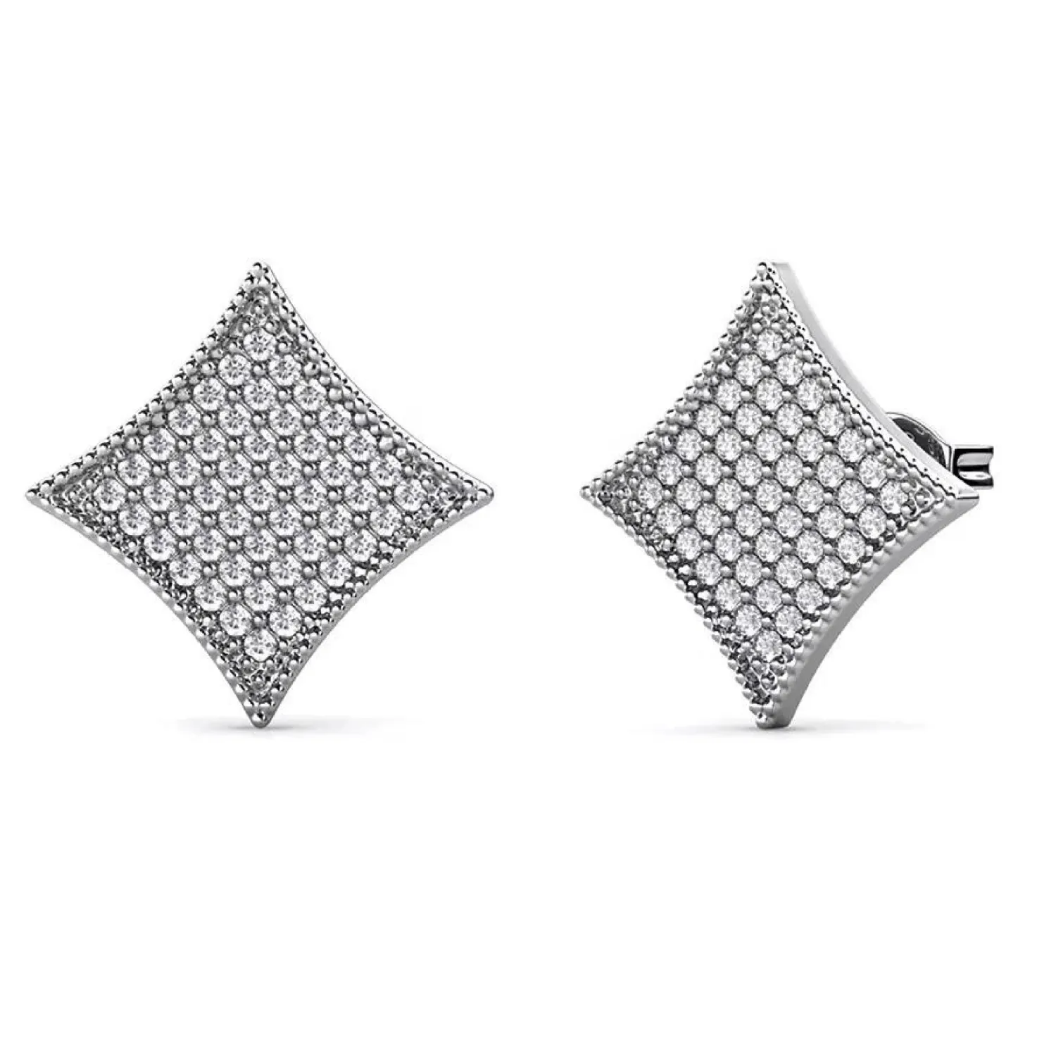 These sharp, modern studs take the shape of a kite or rhombus. The surface is completely covered in dazzling pave cubic zirconia stones, set against a sleek silver-tone finish for a high-impact, luxurious look.