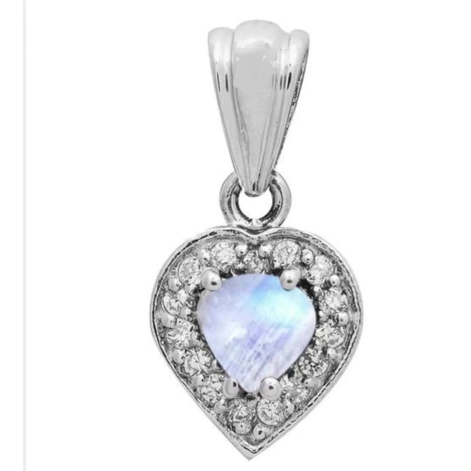 An enchanting pendant featuring a delicate heart-cut Rainbow Moonstone displaying its signature blue flash (adularescence). The moonstone is surrounded by a glittering halo of cubic zirconia, set in a polished sterling silver heart design. Approx. Weight: 2 grams.