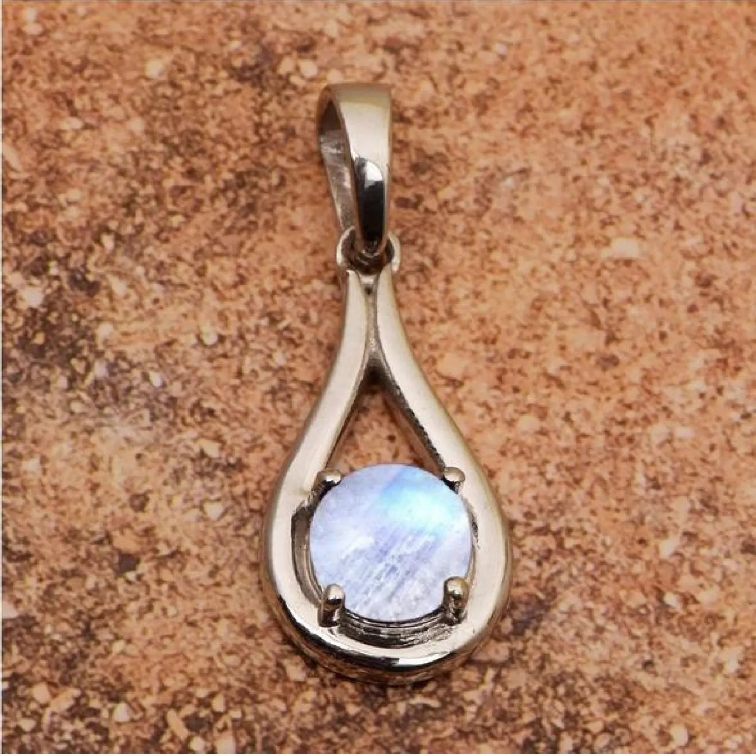 A delicate and ethereal teardrop pendant showcasing a round Moonstone cabochon. The moonstone exhibits a beautiful blue-white adularescence, giving it a soft, glowing appearance. It is gracefully set in a simple sterling silver mounting.